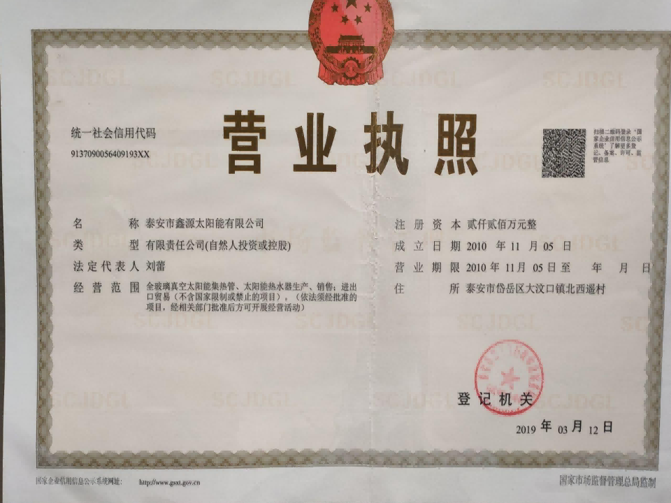 山东省泰安市鑫源太阳能有限公司,现位于山东省泰安市岱岳区大汶口太阳能工业园。主要生产太阳能真空集热管,阳台壁挂式热水器、太阳能发电、等光能源产品。总占地面积35亩约23000平方米,建筑面积达15000平方米。企业职工现有160余名,专业营销团队,科技资深管理人员达20余人。主要产品真空集热管年生产量达400多万支。科技管理,技术创新,质量第一的先进理念下 产品供不应...